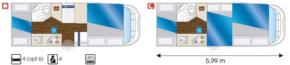 The bela guadeloupe is a four berth campervan with four seatbelts. Its very modern and spacious interior includes bunk beds to the rear and a double bed alcove over the driving area. Separate bathroom with toilet and shower fitted. Large comfortable dining area.