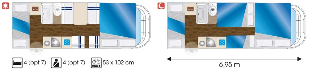 The spacious kitchen invites you to feast and is optionally available with a large refrigerator. The heated alcove invites you to dream with its sleeping area of 155 x 201 cm.